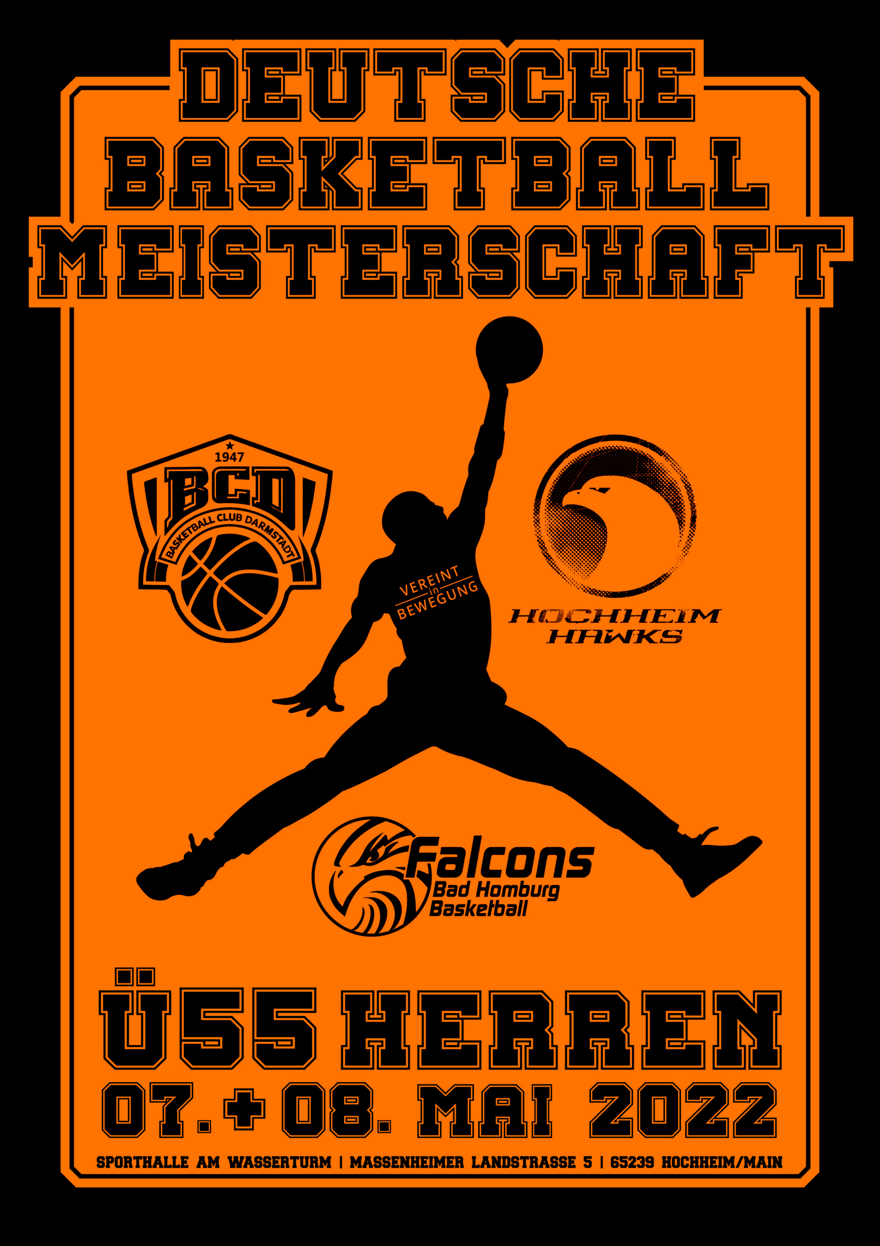 Am 07. und 08. Mai 2022 findet die Deutsche Basketball Meisterschaft der Herren über 55 (Ü55) im Basketballbezirk Darmstadt, in Hochheim am Main statt, und die Basketballer des BC Darmstadt nehmen in einer Spielgemeinschaft mit den TG Hochheim Hawks und dem HTG Bad Homburg teil. Das Turnier beginnt am Samstag um 10:00 Uhr und das Endspiel wird voraussichtlich am Sonntag nach 14:00 Uhr in den Sporthallen am Wasserturm gespielt.